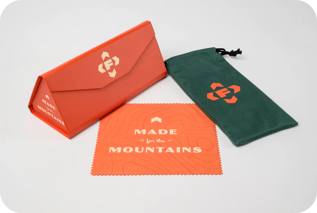 Protect and clean your glasses with environmentally friendly accessories. All FKT sunglasses come accompanied by a protective case, recycled microfiber pouch, and recycled microfiber cleaning cloth.